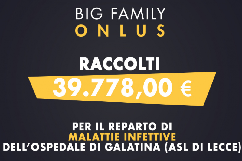 La situazione di emergenza che il nostro Paese ha dovuto affrontare in questi mesi è nota a tutti. La Big Family Onlus ha sostenuto attivamente questa emergenza aprendo una raccolta fondi per poter sostenere l'ASL di Lecce a sostegno degli Ospedali della Provincia, In particolar modo i fondi sono stati allocati per il reparto di Malattie Infettive dell'Ospedale di Galatina.