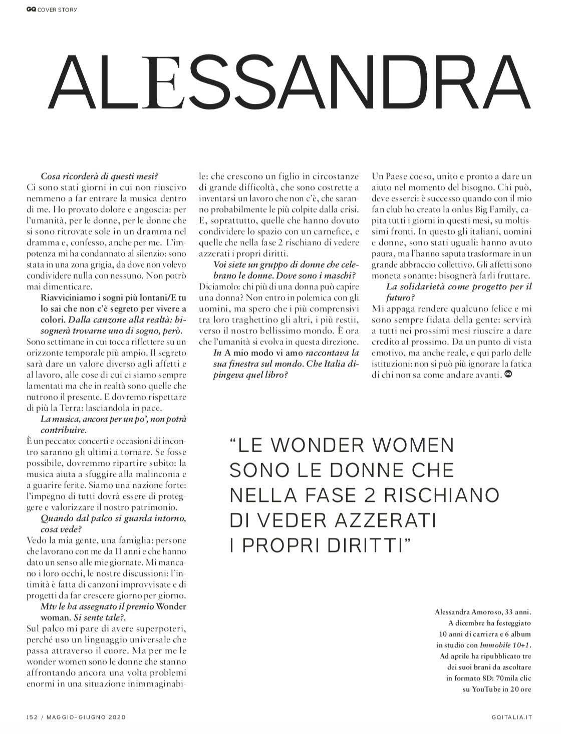 All'interno della rivista anche un'intervista ad Alessandra che ha dichiarato: "Ci sono stati giorni in cui non riuscivo nemmeno a far entrare la musica dentro di me. Ho provato dolore e angoscia: per l'umanità. per le donne, per le donne che si sono ritrovate sole in un dramma nel dramma e, confesso, anche per me. L'impotenza mi ha condannato al silenzio: sono stata in una zona grigia, da dove non volevo condividere nulla con nessuno. Non potrò mai dimenticare". Alessandra racconta a GQ Italia la sua esperienza durante la quarantena ma non solo. Cliccando qui potrete leggere l'articolo completo!